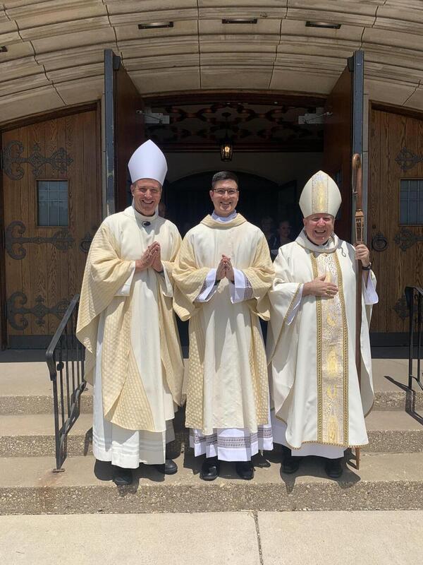 The Rev. Mr. Glick’s diaconal ordination was celebrated at the Cathedral of the Holy Angels through the laying on of hands and the prayer of consecration invoking the Holy Spirit by Bishop Robert J. McClory. AMS Auxiliary Joseph L. Coffey concelebrated the 10:30 a.m. ordination Mass. Among those participating in the pews were the new deacon’s parents, Marcus A. and Joann Glick, and his brother, Marcus B. Glick.
