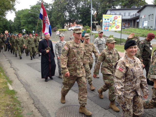 CZĘSTOCHOWA, POLAND – Auxiliary Bishop F. Richard Spencer joined soldiers and military officers from the United States and five other nations in a “Walk for Peace” across parts of Poland. They walked as participants in Poland’s traditional August pilgrimage to the revered Black Madonna, a sacred icon preserved at the historic shrine to Our Lady of Częstochowa, the Queen of Peace. Bishop Spencer serves His Excellency, the Most Reverend Timothy P. Broglio, J.C.D., Archbishop for the Military Services, USA, as his Episcopal Vicar for military installations in Europe and Asia.